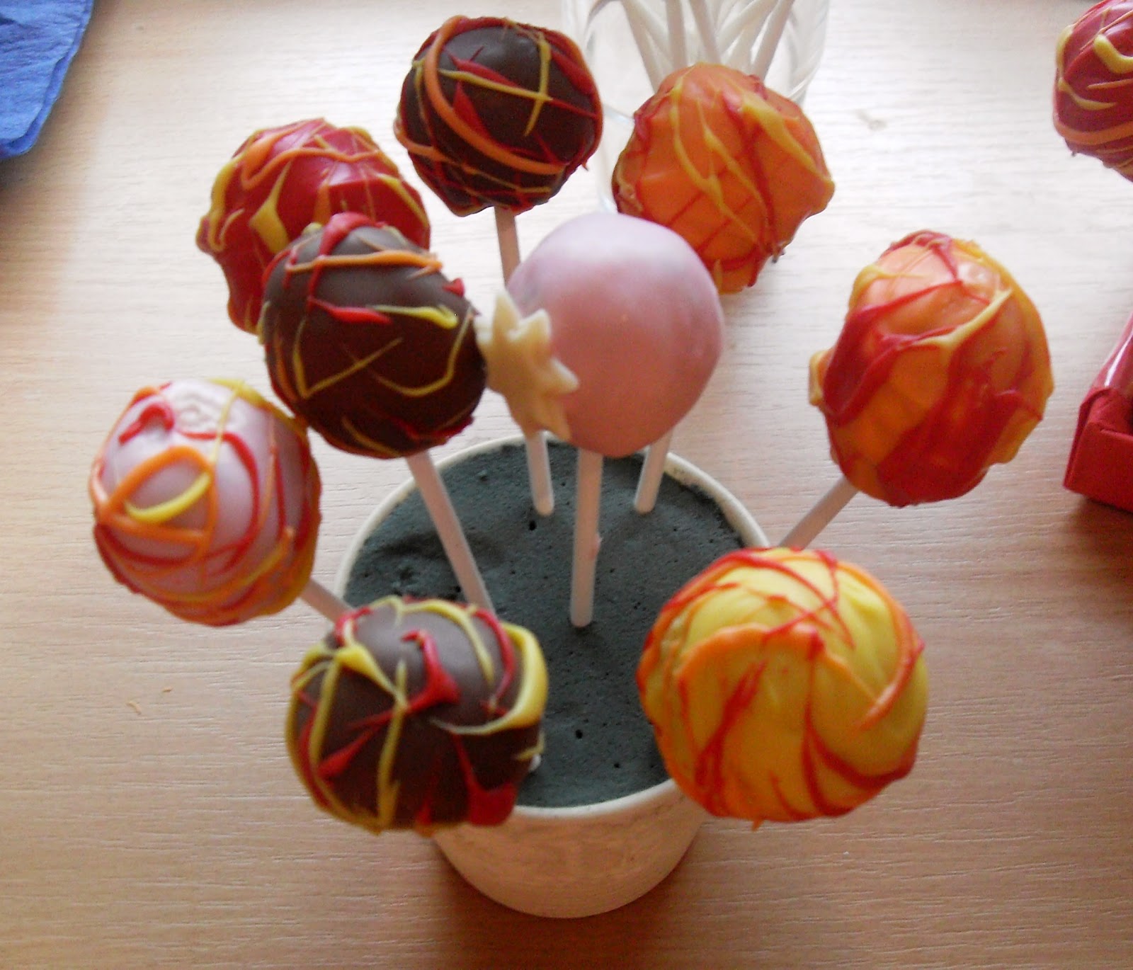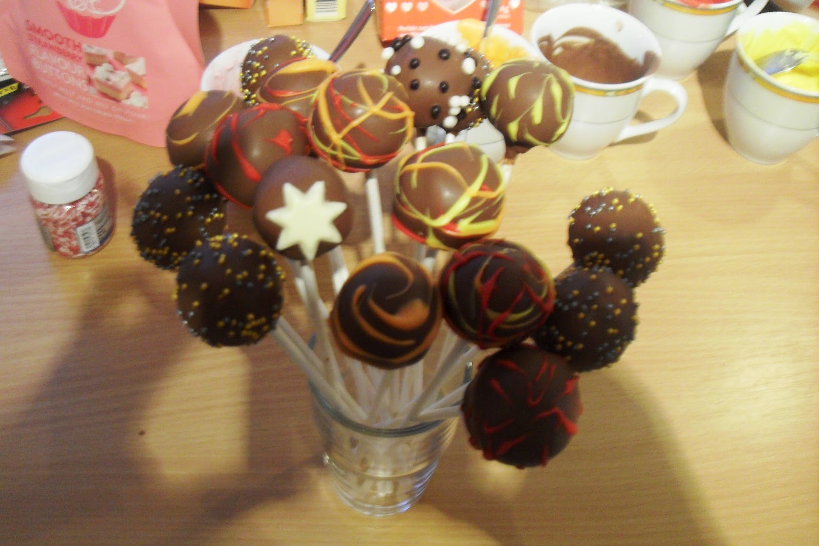 Für das Anbringen der Zuckerstreusel- oder auch Perlen muss man natürlich auch darauf achten, das es zügig vonstatten geht: ist der Überzug zu nass laufen die Streusel herunter, ist er schon zu trocken, halten sie nicht! Hier ist ein schnelles Arbeiten sehr wichtig!Die Renshaw und Wilton Produkte leisten hier sehr gute Werke, denn sie trocknen weitaus schneller als herkömmliche Schokolade und tropfen auch nicht so stark.Bei den Wilton Candy Melts muss ich noch betonen, das die Masse recht dickflüssig ist und eher gar nicht tropft. Hier habe ich den "Überschuss" mit einem kleinen Löffel vorsichtig abgestrichen und dadurch entstanden nochmal sehr schöne Erhebungen/Muster.Für die Kids habe ich die kurzen Cake Pop Sticks verwendet und für die "Erwachsenen"-Cake Pops die langen.
