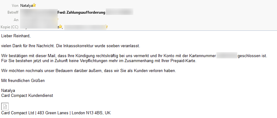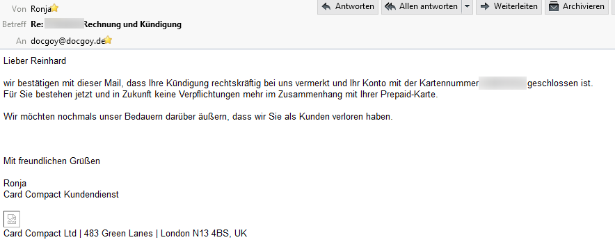 Wie alles begann lesen Sie hier: --> http://blog.twitt-erfolg.de/2015/12/da-hat-mich-der-heiko-hausler-doch-noch.html (was bisher geschah ...)Die 1. Mail an den kompetenten Support von Card Compact Ltd mit der schriftlichen Kündigung habe ich am 5.11.2015 geschickt.