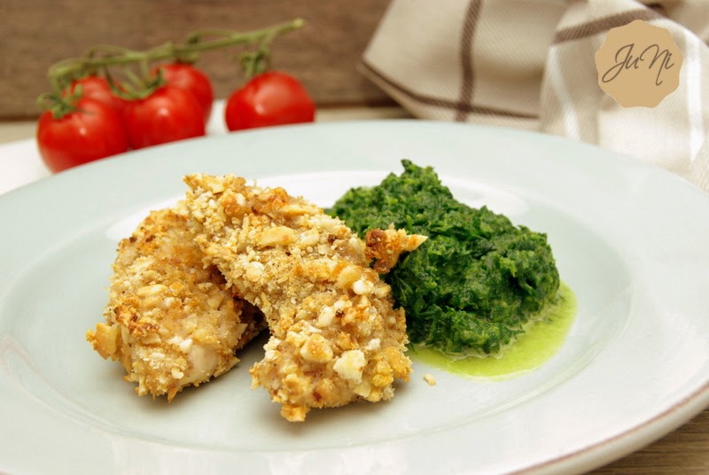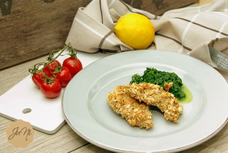 Den Spinat auftauen lassen, am Besten in einem Sieb, damit die Flüssigkeit etwas abtropfen kann. Den Ofen auf ca. 220° vorheizen. Die Hähnchenfilets trocken tupfen, salzen und pfeffern. Das Brötchen zusammen mit den Cashew-Kernen in der Küchenmaschine zerkleinern und die Bröselmasse mit Salz, Pfeffer und etwas Chilliflocken würzen. Das Ei verquirlen und die Hähnchenfilets durch das Ei ziehen, etwas abtropfen lassen und in der Cashew-Brötchen-Masse wälzen. Dabei gut andrücken, damit die Masse auch gut an den Filets haften bleibt.