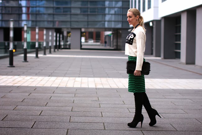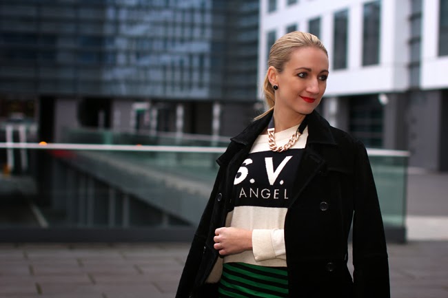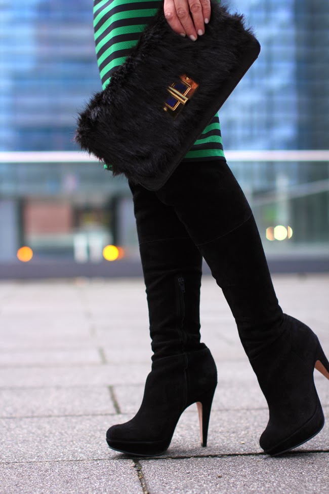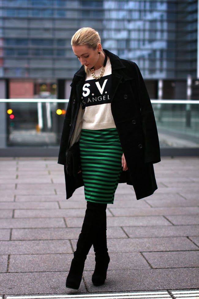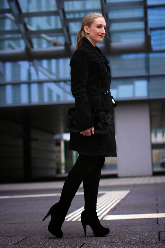 Mein Evergreen: Der schwarze Wildledermantel.Der schwarze Wildledermantel gehört seit circa. vier Jahren zu den Klassikern in meiner eigenen kleinen "Jacken-Mäntel-Abteilung". Zugegebenermaßen trage ich ihn nicht allzu oft. Aber wenn ich ihn zusammen mit meinen schwarzen Wildleder-Overknee-Stiefeln ausführe, fühle ich mich ein bisschen wie Catwoman. Je nachdem, was dazu getragen wird, wirkt die Stiefel-Mantel-Kombi entweder sehr feminin, leicht verrucht, rockig oder stylish. Meine Wahl am letzten Wochenende: Gestreifter Bleistiftrock, cropped Pulli und ein bisschen Bling Bling. - Was sagt ihr zu meinem heutigen Look? Wie schaut Eure "outerwear collection" aus? Daunenmäntel, Duffle coats, Jacken, ...?