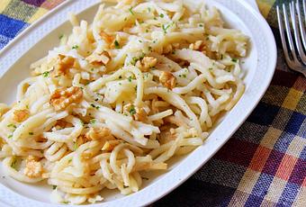 Den Ofen auf 200°C vorheizen. Ein Auflaufform bebuttern. Weichgekochte Eriste in dem Form mit geriebene Käse vermischen. Im vorgeheizten Ofen ca. 10 Minuten backen. Walnusskerne darauf bestreuen und gleich servieren.