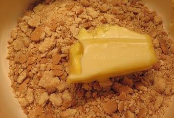 Die Kekse zerbröselt ihr und knetet anschließend die Butter mit hinein .