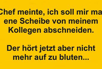 Auf Facebook teilen Vorige Folgende Chef meinte, ich soll mir mal ene Scheibe von... Autor des Artikels : istdaslustig Zum Original-Artikel Chef meinte, ich soll mir mal ene Scheibe von meinem Kollegen abschneiden. Der hört jetzt aber nicht mehr auf zu bluten... Hier geht es zum Artikel Mehr Lustiges auf www.istdaslustig.de Auf Facebook teilen Vorige Folgende Das könnte Ihnen gefallen Mehr