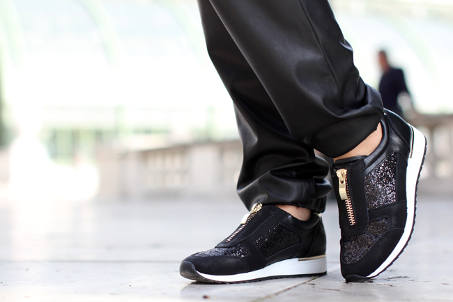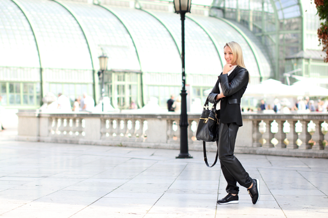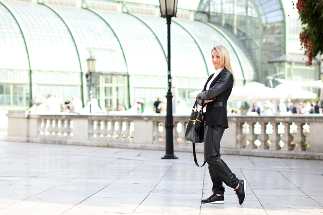 Which kind of shoes do you prefer to wear in colder season? For me these are boots, booties & sneakers - depending from weather, temperature & my very personal mood :-) ... And hereby sneakers may glitter & sparkle like lovely christmas decoration. As in my OOTD. But therefore the rest of my outfit is quite restrained and I'm only using colors black & white and focussing on materials. And the result? A really comfy, casual but also chic look, with whom I'm prolonging my last week's "flats collection" :-) ... - So what do you think about my OOTD?leather track pants - S. Oliver / sweater - Asos / blazer - Mango / bag - Steffen Schraut / sneakers - Deichmann (sponsored)location - Hofburg