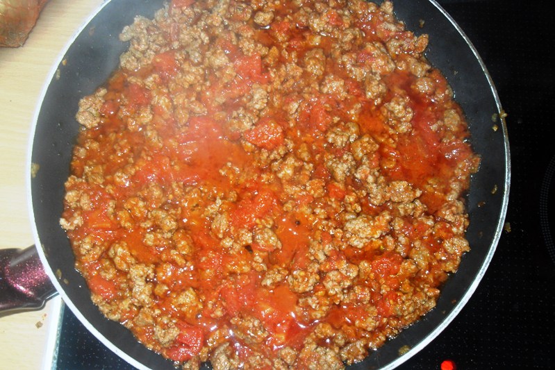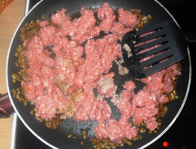Jetzt wieder etwas Öl in die Pfanne geben und auf höchster Stufe erhitzen. Gehacktes in die Pfanne geben und unter Rühren krümelig braten, bis es leicht gebräunt ist (ca. 6-8 Minuten).