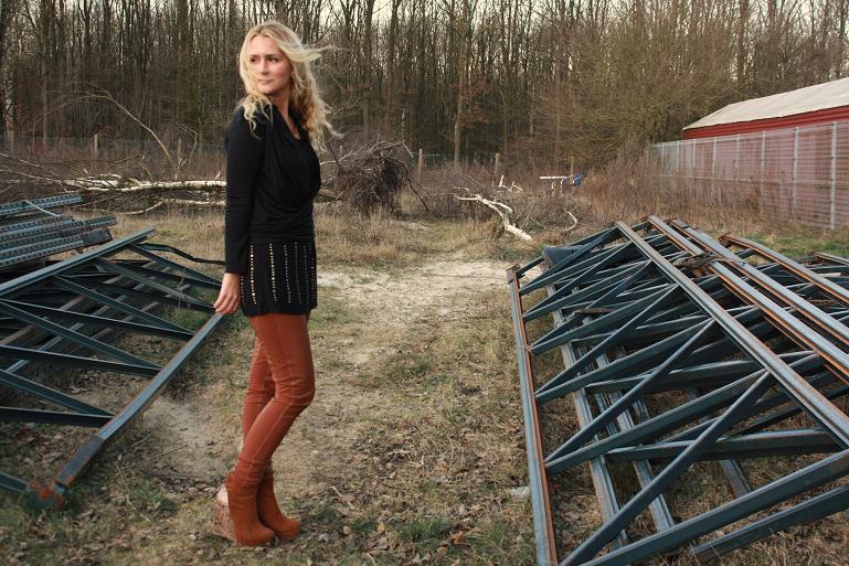 wrap-around top/Wickeloberteil: New Yorker, longtop/langes Shirt: TK Maxx, leather-look pants/Lederhose: H&M, snake booties/Schlangenkeilabsatzbooties: Primark