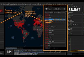 Am Gründonnerstag, 9. April 2020 erscheint eine falsche Fallzahl in der Höhe von 83’080 für Frankreich auf der Echtzeitkarte der Johns Hopkins University . Diese Zahl entspricht dem Stand vom 4. April, also von vor fünf Tagen. Sie kann nicht stimmen, wenn man die Entwicklung der letzten Tage beobachtet hat. Gemäß der ScreenShots ist das nicht möglich. Bin gespannt, wann der Fehler korrigiert wird.