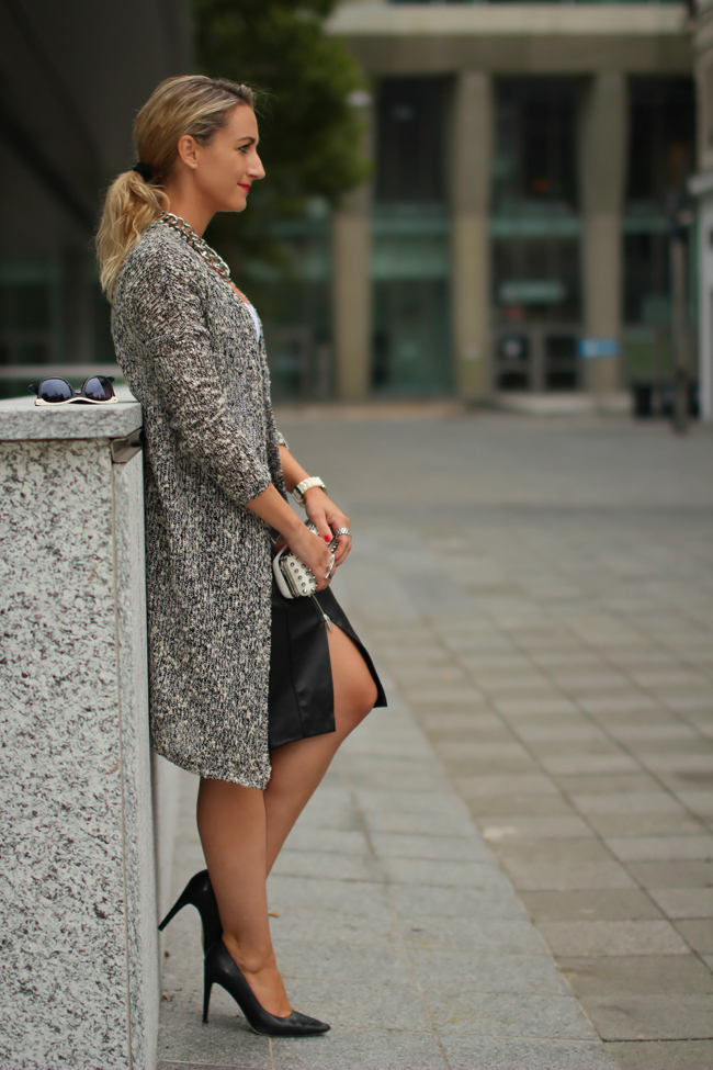 PS.: Ich bin jetzt auch auf Instagram mit dem Usernamen "collectedbykatja" zu finden :-) ...Most people associate cool biker jackets, heavy boots and tight pants with leather. Of course I'm sharing these associations and I really love to wear these things. But leather can do even more. Leather in form of a pencil skirt can be quite elegant - especially combined with a cozy, long knitted cardigan and classy pumps. This pencil skirt is even suitable for office, wearing a white blouse instead of cropped top. - What do you think about leather? How and when do you wear leather?