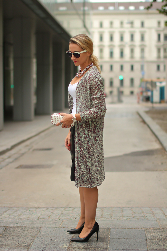 skirt - Zara / top - Intimissimi / cardigan - Tally Weijl / shoes - Deichmann / clutch - Forever 21 / sunglasses - no name / necklaces - LookbookStore, H&M / rings - D&G, LookbookStore, engagement ring / watch - no namelocation - Sparefrohgasse