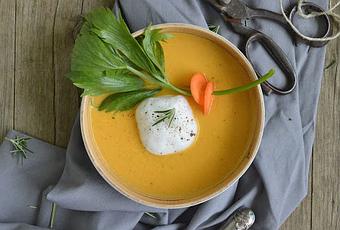 Zubereitung der Suppe:- Die Zwiebel kleinhacken und mit etwas Öl andünsten. Die Möhren waschen, schälen, in dünne Scheiben schneiden und kurz in Öl schwenken. - Das Curry mit den Karotten vermengen und mit der Gemüsebrühe aufgießen. - Die Suppe auf mittlerer Stufe köcheln lassen. - Honigmelone in kleine Würfel schneiden und mit dem Liebstöckel in die Suppe geben. - Kurz nochmal durchrühren und mit dem sauer Rahm gut pürieren. - Zum Schluss mit Salz und Pfeffer abschmecken.