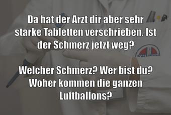 Auf Facebook teilen Vorige Folgende Da hat der Arzt dir aber sehr starke Tabletten... Autor des Artikels : istdaslustig Zum Original-Artikel Da hat der Arzt dir aber sehr starke Tabletten verschrieben. Ist der Schmerz jetzt weg? Welcher Schmerz? Wer bist du? Woher kommen die ganzen Luftballons? Hier geht es zum Artikel Mehr Lustiges auf www.istdaslustig.de Auf Facebook teilen Vorige Folgende Das könnte Ihnen gefallen Mehr
