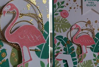 Doch inzwischen hatte ich Zeit und dabei ist unter anderem diese Karte entstanden. Irgendwie gefällt mir der Flamingo gemeinsam mit golden embossten Elementen, ich weiß auch nicht, warum, eigentlich gehört das doch gar nicht zusammen, oder?