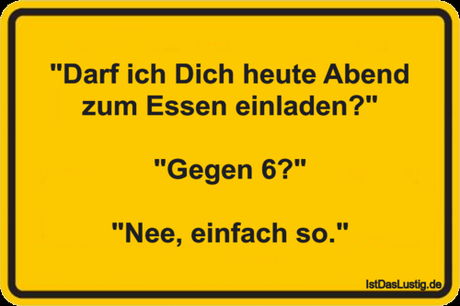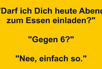 Auf Facebook teilen Vorige Folgende "Darf ich Dich heute Abend zum Essen... Autor des Artikels : istdaslustig Zum Original-Artikel "Darf ich Dich heute Abend zum Essen einladen?" "Gegen 6?" "Nee, einfach so." Hier geht es zum Artikel Mehr Lustiges auf www.istdaslustig.de Auf Facebook teilen Vorige Folgende Das könnte Ihnen gefallen Mehr