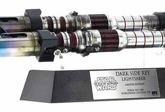 Die EFX Collectibles-Version des Scharniersäbels ist eine Nachbildung aus dem Trailer - komplett mit einer Plakette mit der Aufschrift ‚Dark Side Rey Lightsaber'. EFX fertigte das Replikat aus massivem Aluminium und allen Metallteilen. Die Macher waren in der Lage, die von Lucasfilm gelieferten Requisiten des Films zu studieren, um einen präzisen Säbel bis hin zur Verwitterung zu schaffen. EFX rühmt sich auch, dass das Scharnier, das die beiden Klingen verbindet, dasselbe Stück ist, das in der echten Requisite verwendet wird.