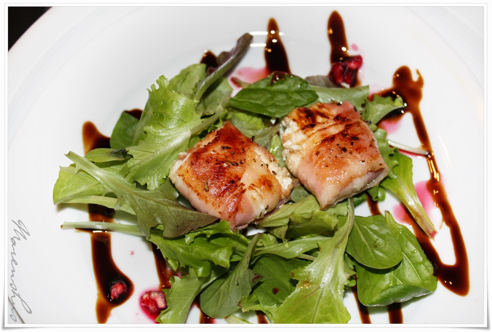 Der erste Gang ist ein gemischter Salat mit Granatapfelkernen und zwei Päcken aus scharf angebratenen, speckummantelten Ziegenkäsetalern.