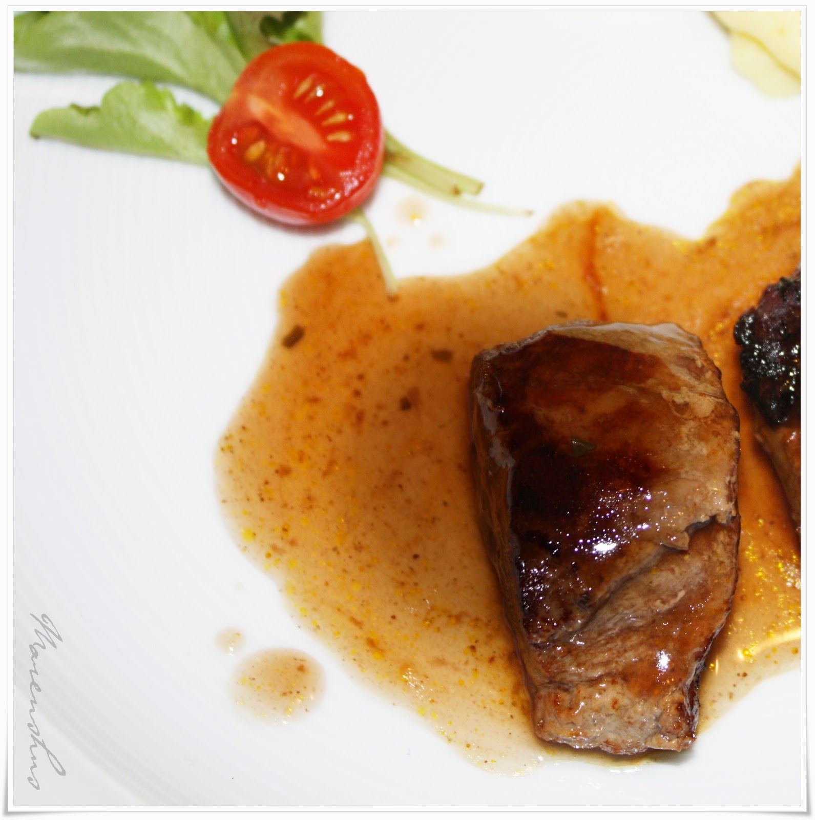 Hauptgang: gebratenes Rehfilet aus dem Wald nebenan, Safrankartoffelpürree und Salatsträußchen, Rotweinsauce.
