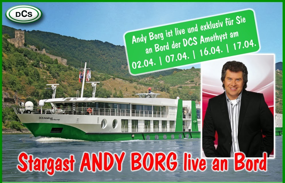 Treffen Sie Andy Borg auf Ihrer nächsten Flussreise auf der DCS Amethyst! Folgende Termine sind möglich. 02.04.oder 07.04. oder 16.04 und 17.04. 2014. Das ganze können Sie im Rahmen der Schmankerlkreuzfahrten auf der Donau erleben. Die Kreuzfahrten starten und enden jeweils in Passau und gehen bis Budapest. Diese Reise erhalten Sie schon 499,- pro Person in der 2 Bettkabine. Viele kleine Annehmlichkeiten die Sie sonst oft extra zahlen sind bereits in den Reisepreis eingeschlossen. Mehr zu Dieser aber auch zu allen anderen Reisen der DCS Amethyst erfahren Sie unter www.DCS-Touristik.de.