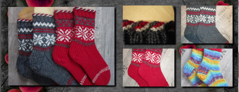 Die grauen Socken sind Vickys, aus 6facher Regia,Gr. 39die roten Franzis, auch aus 6facher Regia. Gr. 36die bunten aus Regia 4fach doppelt und Opal x-large snowflake, 8fachdie Norwegersocken haben jeweils einen dreifarbigen gedrehten Rand