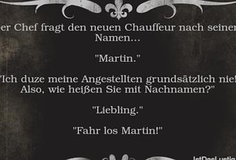 Auf Facebook teilen Vorige Folgende Der Chef fragt den neuen Chauffeur nach seinem... Autor des Artikels : istdaslustig Zum Original-Artikel Der Chef fragt den neuen Chauffeur nach seinem Namen... "Martin." "Ich duze meine Angestellten grundsätzlich nie! Also, wie heißen Sie mit Nachnamen?" "Liebling." "Fahr los Martin!" Hier geht es zum Artikel Mehr Lustiges auf www.istdaslustig.de Auf Facebook teilen Vorige Folgende Das könnte Ihnen gefallen Mehr