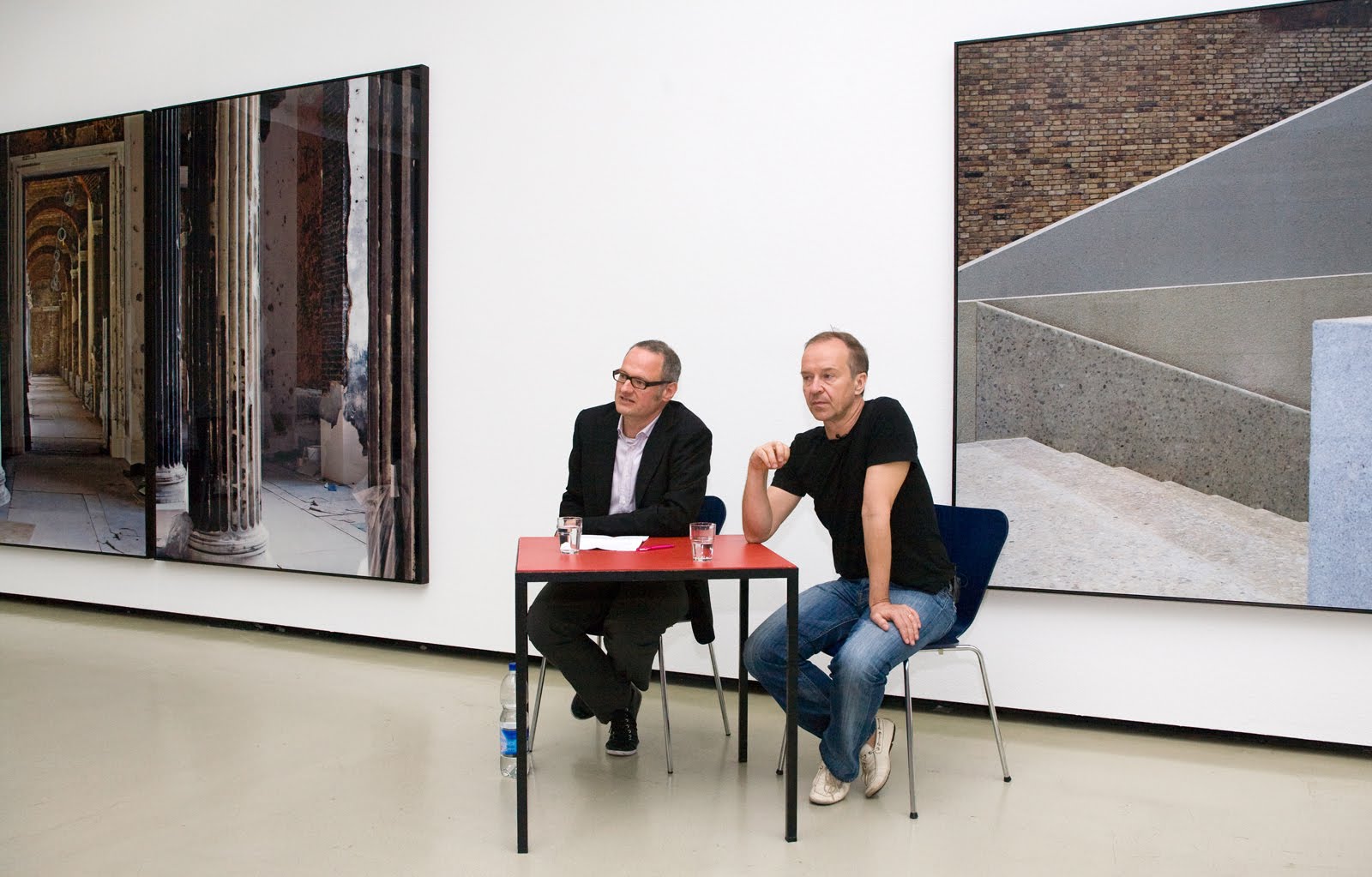 Großformatige Architekturfotografien sind eine Spezialität des Fotografen Thomas Florschütz. Eindrucksvoll dokumentierte er den Wiederaufbau des Neuen Museums in Berlin - wie in den beiden Arbeiten, die oben im Bild zu sehen sind. Architektonische Details gewinnen ästhetische Qualitäten jenseits von Wiedererkennung, die Architekturfotografie zumeist anstrebt. Doch der abstrakte Wert hält sich mit dem Dargestellten die Waage. In dieser Hinsicht treffen die Arbeiten die Essenz von Fotografie, die als Kunstform ja ihren Reiz stets aus der Spannung zwischen einer dem Medium eigenen Abbildlichkeit und der Eigenständigkeit der Wahrnehmung bezieht. Und Florschütz, der 1957 in Zwickau geboren wurde, gelingt es, auf diese Weise den Charakter der abgelichteten Bauten besonders gut zu erfassen. Denn die Lichtführung beispielsweise betont die atmosphärischen Stärken dieser Räume, die wie im Falle des Neuen Museums in großer Einfühlsamkeit historische Verwundungen – als Folge der Kriegszerstörungen verfiel die Ruine Jahrzehnte lang - in Renovierung und Neubau einbeziehen.Dem ehemalige Palast der Republik widmet Florschütz eine andere Bildserie. Er fotografierte die Ruine während des monatelangen Rückbaus und hält so einen melancholischen Schwebezustand fest. Die Fotos legen darüber hinaus einen spezifischen Umgang mit Geschichte bloß; durch das offene Stahl-Gerüst und über Regenpfützen hinweg fällt der Blick auf das Stadtpanorama der Berliner Mitte, einschließlich Fassaden-Attrappe der zu DDR-Zeiten abgerissenen Schinkelschen Bauakademie. Es wird deutlich, dass Geschichtsschreibung nicht zuletzt über Architektur funktioniert. Bauten werden nach ihrem Identifikationswert bemessen, und was gerade nicht in die Politik passt, muss weichen. Dafür baut man dann halt was anderes wieder auf und tut so, als habe es schon immer da gestanden. Berlin ist dafür ein eindrückliches Beispiel - aber das ist ein anderes Thema.Die Fotos von Florschütz wirken nicht zuletzt über ihre Größe. Das wird schnell klar, vergleicht man die Ausstellungsversion des oben beschriebenen Palast-Motives - 2,53 x 1,83 m - mit der käuflichen Edition, einem Inkjet-Print in 58x80 cm. - Die Entdeckung, was Qualität und Größe mit einem Motiv machen, fand ich überaus aufschlussreich. Und nachahmenswert. In Zukunft werde ich meine Bilder auch schön groß machen. Was man nicht übersehen kann, muss ja auch irgendwie gut sein;-) So, nach diesen seriösen Ausführungen muss ich noch eine Bemerkung zu einem der Katalog-Beiträge loswerden. Da verbreitet einer der Text-Autoren doch tatsächlich wieder einmal das Märchen von der Analogfotografie als der wahren Fotografie. Na so was, ich dachte das hätten wir inzwischen geklärt... Florschütz fotografiert ja in analogem Mittelformat, lässt die Dias dann scannen und die Daten auf Fotopapier ausbelichten. In der Tübinger Pressekonferenz erklärte er, dass - als er in den 1990-er Jahren mit den ausgestellten Serien angefangen hat, digitale Sensoren noch nicht in vergleichbarer Qualität erhältlich gewesen seien. Einzig aus diesem Grund habe er das analoge Verfahren vorgezogen und sei ihm dann bis jetzt treu geblieben. Da hätte der Katalog-Schreiber Johannes Meinhardt doch mal genauer nachgefragt oder hingehört bevor er seine Klischees verbrät: "Entscheidend ist, dass Thomas Florschütz in seinen Bildern zwei der wichtigsten Geheimnisse der analogen Fotografie (nur diese ist Fotografie im starken Sinne des Wortes -...) offenbart." Roland Barthes wird in der Folge zum Kronzeugen für die alleinige Kunstwürdigkeit des Analogen, da sich nur dort die optischen Strahlen materiell in die Silberschicht eingegraben haben...Der arme Barthes, für was der alles herhalten muss. Dabei bin ich nach wie vor überzeugt, dass der französische Essayist, würde er noch leben, ein großer Fan der Digitalfotografie geworden wäre, siehe Blog-Eintrag "Der leuchtende Schatten" vom 10. Mai 2010. Hier nochmals das Barthes-Original-Zitat: "Ich bin kein Photograph, nicht einmal ein Amateurphotograph; dafür habe ich zu wenig Geduld: ich muß auf der Stelle sehen können, was ich gemacht habe.“