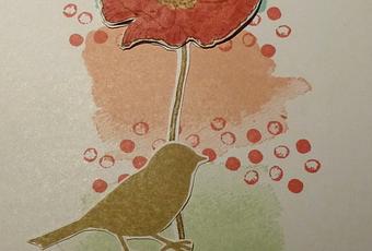 Dieses Werk enthält einen Favoriten aus dem Frühjahrs-/Sommerkatalog 2014 von Stampin Up: Happy Watercolour. In Kombination mit den In Colors 2013-2015 ist das Set eine wahre Quelle für Ideen. Der Spruchstempel ist inkystamp und der Vogel ist aus dem GGSet Sommermorgen. Als Farbe hat sich ein wenig Wildleder eingeschlichen. Die Blume habe ich zweimal gestempelt. Dann habe ich das Motiv über den Kuli ein wenig gerundet, so sieht sie etwas plastischer aus.
