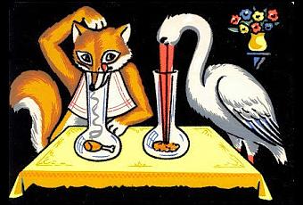 Ein Fuchs hatte einen Storch zu Gast gebeten, und setzte die leckersten Speisen vor, aber nur auf ganz flachen Schüsseln, aus denen der Langschnabel nichts fressen konnte. Gierig fraß der Fuchs so alles allein, obgleich er den Storch unaufhörlich bat, es sich doch schmecken zu lassen.