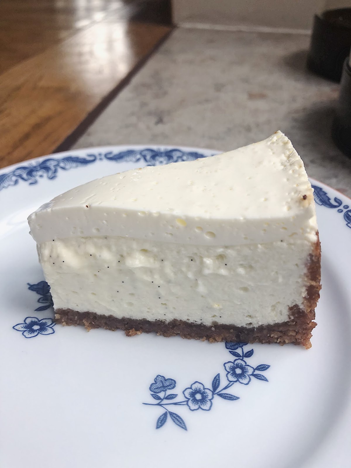 A very creamy cheese cake that is not too sweet, has a subtle lemon taste with bits of vanilla. It's prepared quickly, the only thing that takes longer are the waiting times in between prep steps.