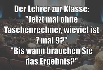 Auf Facebook teilen Vorige Folgende Der Lehrer zur Klasse: "Jetzt mal ohne... Autor des Artikels : istdaslustig Zum Original-Artikel Der Lehrer zur Klasse: "Jetzt mal ohne Taschenrechner, wieviel ist 7 mal 9?" "Bis wann brauchen Sie das Ergebnis?" Hier geht es zum Artikel Mehr Lustiges auf www.istdaslustig.de Auf Facebook teilen Vorige Folgende Das könnte Ihnen gefallen Mehr