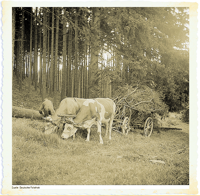 auf der Stirn - es ist aus Leder und mit Stroh gefüttert - damit die Tiere sich nicht so weh tun,vereinfacht gesagt.Der gezeigte Wagen ist mit "Wellern" voll beladen, also kleineren Ästen.Es gab natürlich auch die Variante mit Mist befüllt, dann meist ohne "Leitern" undab und an wurde auch ein hölzernes Wasserfass gefahren.Eine langsame Art des Transport, wenn man sich die schnell fahrenden heutigen Traktorendazu vorstellt.Welche Erinnerungen habt Ihr an Leiterwagen?
