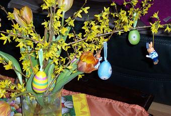 Hier seht ihr unseren Osterstrauß. Ursprünglich ein Geburtstagsstrauß aus orangen Tulpen. Die Zweige kamen erst zu Ostern dazu. Mir gefällt die Kombination von gelb und orange. Das ist das erste Mal, das wir so einen Osterstrauß hatten. Normalerweise hatten wir nur Forsytienzweige, ohne Tulpen.