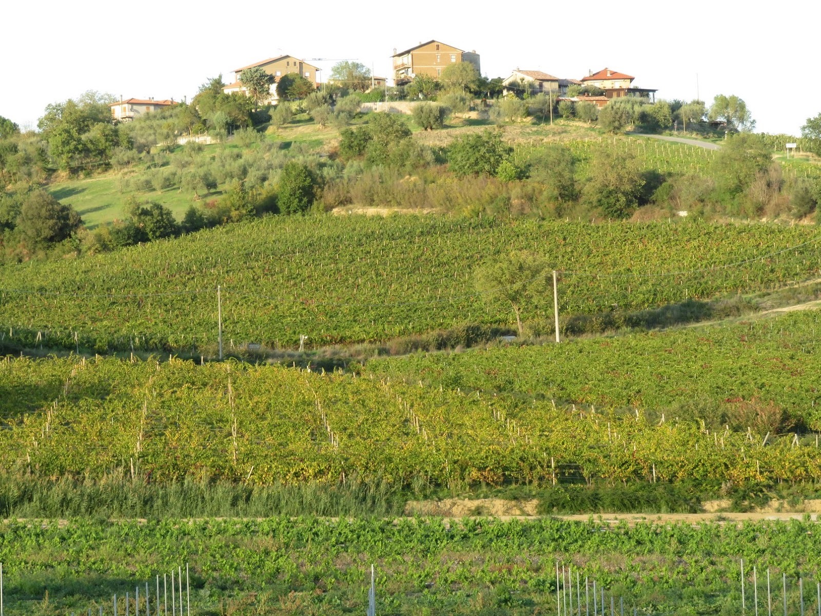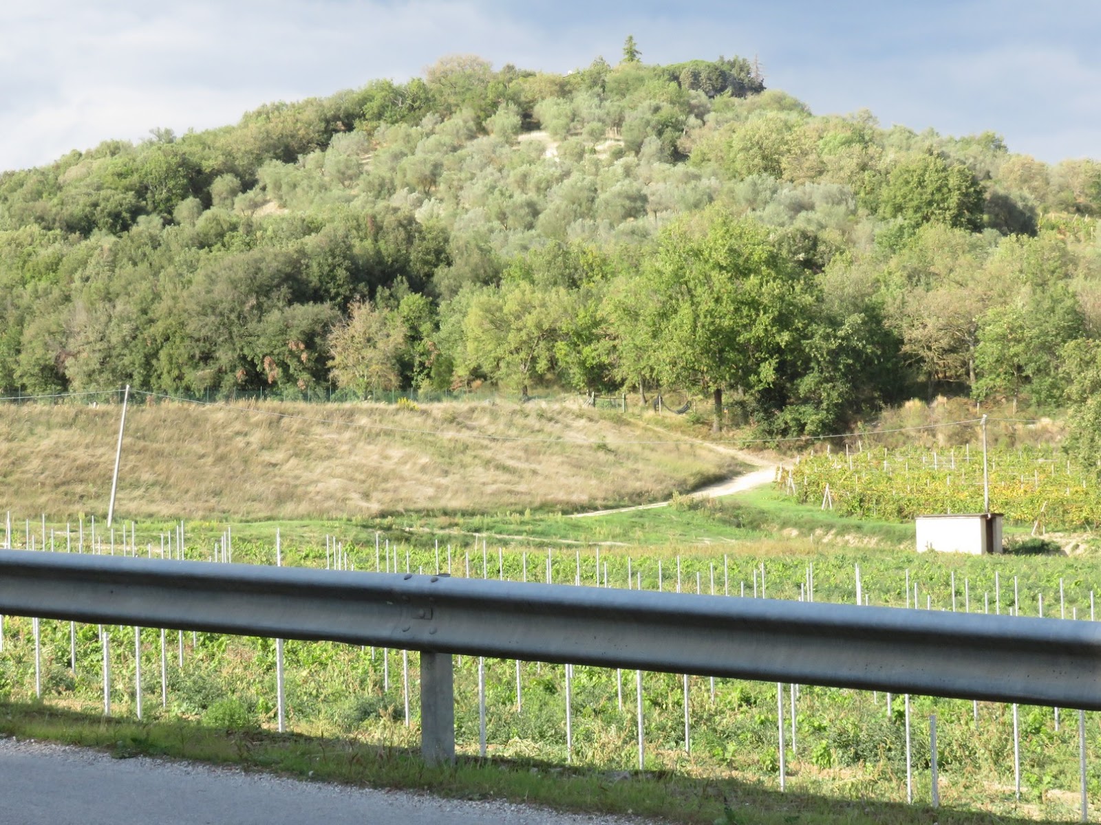 Unsere örtliche Reiseleiterin hatte uns erzählt, dass dieser Sommer in Umbrien besonders trocken gewesen sei (und die Wein- und Olivenernte stark reduziert habe). Im Landschaftsbild war von dieser Trockenheit jedoch nichts zu sehen, Umbrien präsentierte sich uns so, wie es in der Touristenwerbung vorzugsweise darstellt: Als "grünes Umbrien" (auch "grünes Herz Italiens"). So auch hier bei dem Weingut (eigentlich: Agrarbetrieb, denn außer Wein baut das Unternehmen auch Oliven an) Pucciarella: