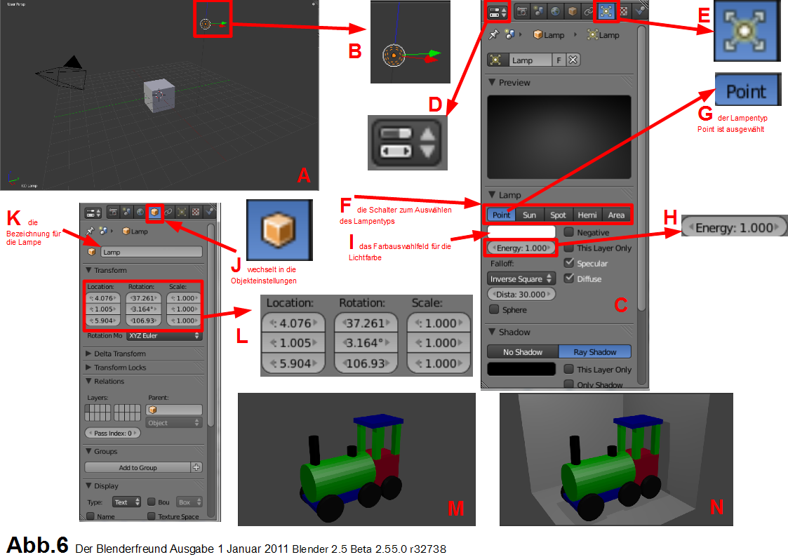 Blender stellt uns 5 verschiedene Lampentypen zur Verfügung (Abb.6 F). Dies sind Point, Sun, Spot, Hemi und Area. Je nach Typ ändern sich im Properties-Fenster auch die Möglichkeiten für die Einstellungen.Die Point-Lamp ist eine rundum leuchtende, punktförmige Lichtquelle. Die Sun-Lamp erzeugt parallele Lichtstrahlen konstanter Intensität. Wie der Name Spot-Lamp schon vermuten lässt, erzeugt diese einen Lichtkegel, der von der Spitze des Kegels ausgeht und in eine bestimmte Richtung zeigt. Die Hemi-Lamp müssen wir uns als eine die Szene umgebenden Halbkugel vorstellen, von der ein gleichmäßiges Licht ausgesendet wird. Die Area-Lamp können wir uns wie eine leuchtende Wand vorstellen. Das Licht, das sie abstrahlt besitzt eine flächige Ausdehnung.Wenn wir die Kamera in einer sonst leeren Szene genau auf einen der zuvor beschriebenen Lampentypen ausrichten und dann das Bild berechnen, werden wir feststellen, diese Lampen selbst sind nicht sichtbar. Blender stellt nur das Licht dar, welches diese Lampen aussenden.Auch der Umgang mit Licht braucht viel Übung und Erfahrung. Ein sehr häufiger Anfängerfehler ist, dass man versucht ein Objekt in einer ansonsten völlig leere Szene aus zu leuchten (Abb.6 M). Hier fehlen natürlich Lichtreflexionen, Schattenwurf und vieles andere mehr. Darum ist es hilfreich das Objekt zumindest auf eine Grundfläche und eine Wand zu stellen. Ich selbst nehme gerne einen Würfel als einfachen Raum für das Objekt, bei dem ich die obere und die vorderen Seiten gelöscht habe (Abb.6 N).