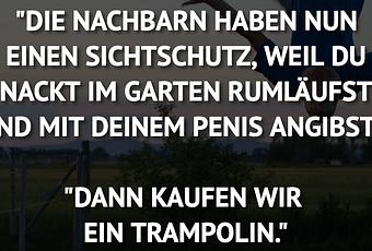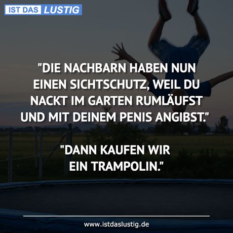 Auf Facebook teilen Vorige Folgende "DIE NACHBARN HABEN NUN EINEN SICHTSCHUTZ, WEIL... Autor des Artikels : istdaslustig Zum Original-Artikel "DIE NACHBARN HABEN NUN EINEN SICHTSCHUTZ, WEIL DU NACKT IM GARTEN RUMLÄUFST UND MIT DEINEM PENIS ANGIBST." "DANN KAUFEN WIR EIN TRAMPOLIN." Hier geht es zum Artikel Mehr Lustiges auf www.istdaslustig.de Auf Facebook teilen Vorige Folgende Das könnte Ihnen gefallen Mehr