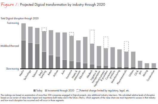 "The truth is that both the digital world and the physical one are indispensable parts of life and of business. The real transformation taking place today isn’t the replacement of the one by the other, it’s the marriage of the two into combinations that create wholly new sources of value. This is a phenomenon we at Bain call Digical" (Quelle: Bain & Company)Es wird deutlich, dass in den meisten Branchen das Transformationspotential noch beträchtlich ist.