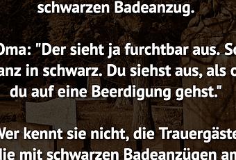 Oma: "Der sieht ja furchtbar aus. So ganz in schwarz. Du siehst aus, als ob du auf eine Beerdigung gehst."