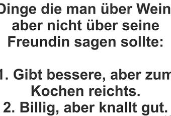 Auf Facebook teilen Vorige Folgende Dinge die man über Wein, aber nicht über seine... Autor des Artikels : istdaslustig Zum Original-Artikel Dinge die man über Wein, aber nicht über seine Freundin sagen sollte: 1. Gibt bessere, aber zum Kochen reichts. 2. Billig, aber knallt gut. Hier geht es zum Artikel Mehr Lustiges auf www.istdaslustig.de Auf Facebook teilen Vorige Folgende Das könnte Ihnen gefallen Mehr