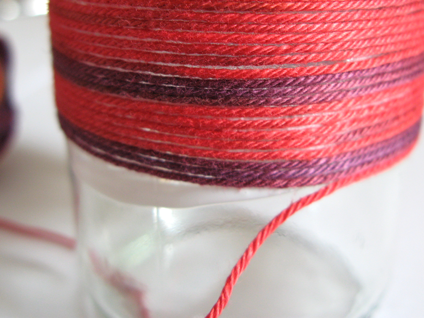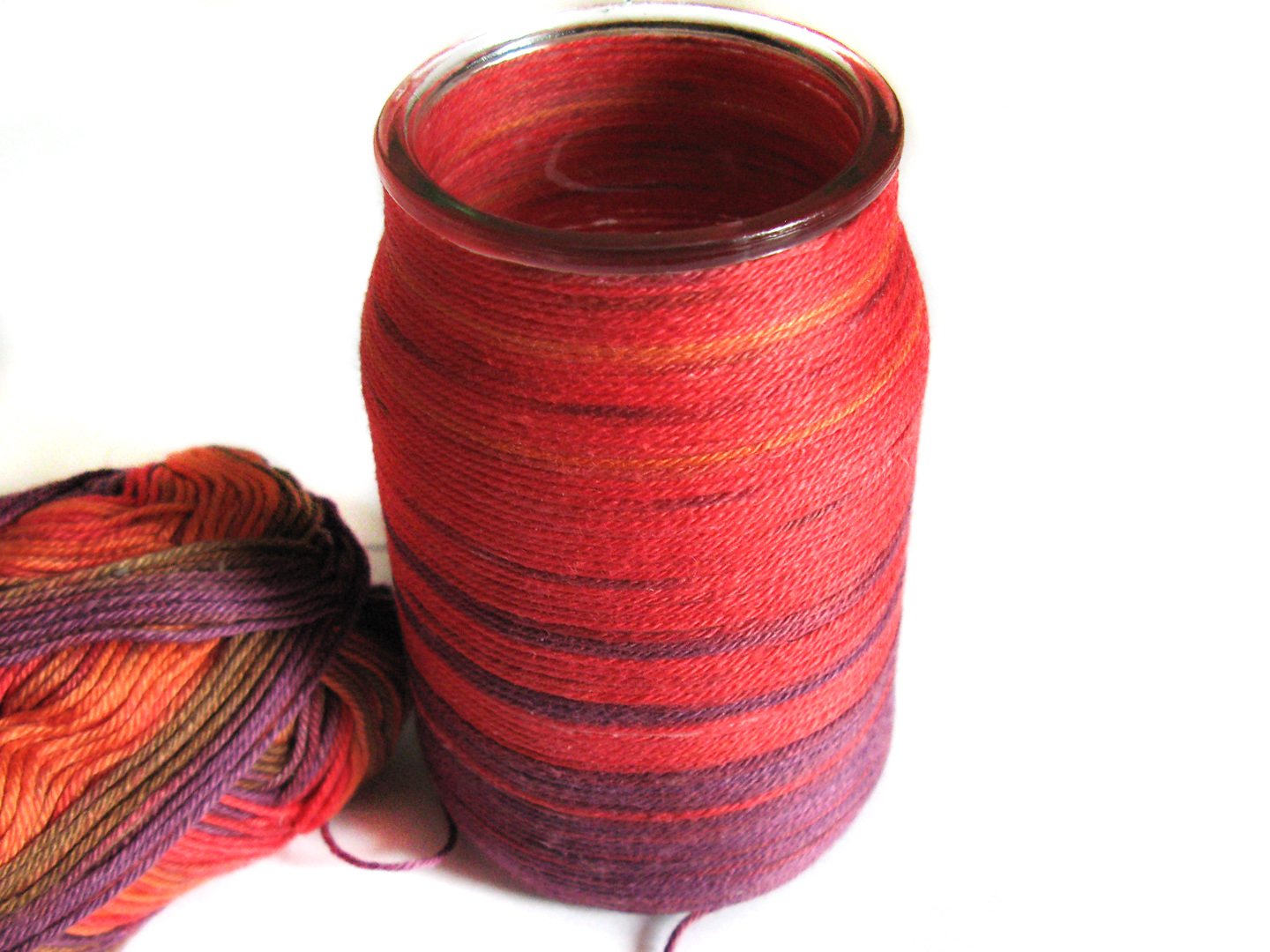 Ich habe eine Wolle verwendet, deren Farbe sich immer wieder ändert - das ist praktisch und einfach! Aber natürlich könnt ihr auch mehrere Wollstücke von verschiedenen Knäulen auf einem Glas aneinandersetzten und so Ringe und Muster gestalten!