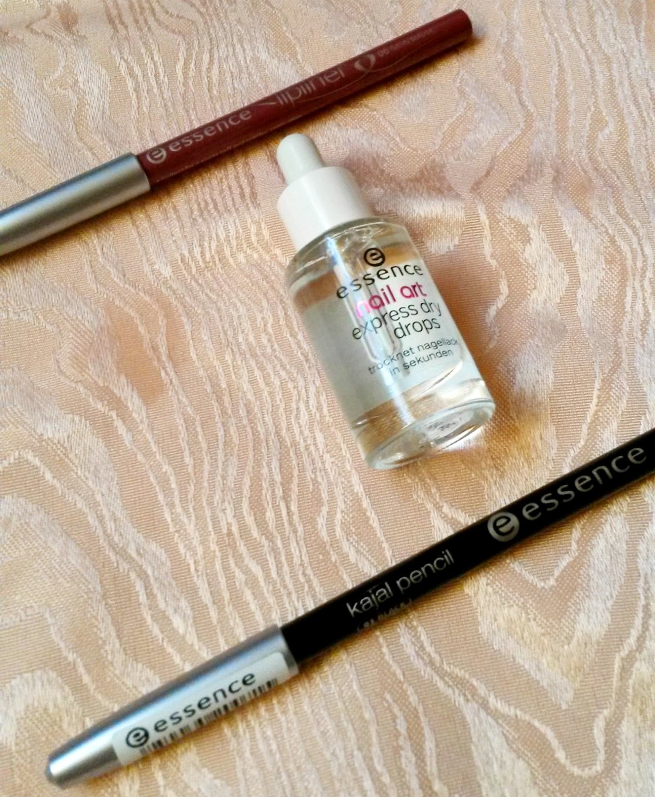Essence Kajal pencil in schwarz Für die untere und obere Wasserlinie. Beim swatchen im Dm hat sie mich überzeugt. Etwa 1 Euro.Essence Nail Art Express Dry Drops Ich hab in einem Blog gelesen das sie wirklich in 5 Minuten durchgetrocknet sind. Da musste ich mir es einfach kaufen. Ist eine Art Pipette mit dem man die Flüssigkeit auf den lackierten Nagel gibt. Um die 2 Euro.