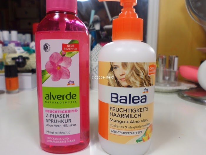 Alverde Feuchtigkeits 2 Phasen SprühkurAuf YouTube hat man mit diese Sprühkur als Haaröl Alternative empfohlen und ich hab einfach mal zugegriffen. :) Ich benutze es statt im feuchten Haar im trockenen Haar und das klappt ganz gut :) Den Duft finde ich auch mittlerweile sehr angenehm :)Preis: 2,45€Ein weiteres Haarprodukt war die Balea Feuchtigkeitshaarmilch in Mango & Aloe VeraDa mein Haare sehr trocken sind in den Längen (im Januar gehts zum Friseur!), habe ich mal wieder zu diesem Produkt gegriffen. Es enthält leider Silikone, was ich jetzt okay finde. Aber bestimmt interessant für einige von euch! :)Preis: 1,95€