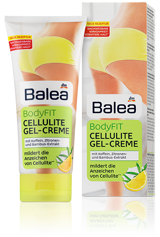 BodyFIT Cellulite Gel-CremeStraffere Haut, jeden Tag: Balea BodyFIT Produkte pflegen die Haut glatt und geschmeidig und steigern ihre Elastizität. Sichtbare Zeichen für Cellulite sind eine unregelmäßige Struktur und verminderte Elastizität der Haut sowie Unebenheiten an ihrer Oberfläche. Diese Anzeichen werden schon nach einem Monat nachweisbar gemildert.*/**Balea BodyFIT Cellulite Gel-Creme verfügt über eine Wirkstoffkombination aus Koffein, Zitronen-Extrakt und Bambus-Extrakt. Das Erscheinungsbild der Haut an den Problemzonen an Bauch, Beinen und Po wird sichtbar geglättet und verbessert.** Straffere und elastischere Haut bei 85% der Testerinnen.*Leichte, schnell einziehende und leicht kühlende Gel-Formulierung. Für ein zartes, geschmeidiges Hautgefühl.Die Balea BodyFIT Cellulite Gel-Creme ist vegan.* Wirksamkeitstest mit 20 Probandinnen.** Anwendungstest mit 30 Testerinnen.200 ml:3,95 €(100 ml: 1,98 €)
