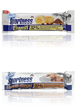 Sportness Eiweiß-Riegel Banane-Kakao-CrispiesDer Riegel mit leckerem Bananen-Kakao-Crispies-Geschmack ist mit einer dünnen Schicht Zartbitterschokolade überzogen und hat einen Eiweiß-Gehalt von 32 %.Der Sportness Eiweiß-Riegel Banane-Kakao-Crispies ist nicht vegan.Sportness Eiweiß-Riegel Cookies & CreamDer Riegel mit Cookies & Cream-Geschmack mit 32 % Eiweiß ist mit leckerer Vollmilchschokolade überzogen.Der Sportness Eiweiß-Riegel Cookies & Cream ist nicht vegan.Banane-Kakao-Crispies(45 g):0,75 €(100 g: 1,67 €)Cookies & Cream (45 g): 0,70 €(100 g: 1,56 €)7