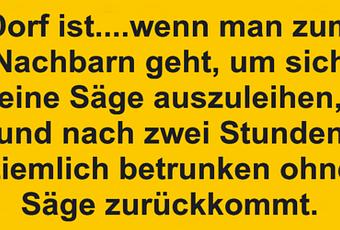 Auf Facebook teilen Vorige Folgende Dorf ist....wenn man zum Nachbarn geht, um sich... Autor des Artikels : istdaslustig Zum Original-Artikel Dorf ist....wenn man zum Nachbarn geht, um sich eine Säge auszuleihen, und nach zwei Stunden ziemlich betrunken ohne Säge zurückkommt. Hier geht es zum Artikel Mehr Lustiges auf www.istdaslustig.de Auf Facebook teilen Vorige Folgende Das könnte Ihnen gefallen Mehr
