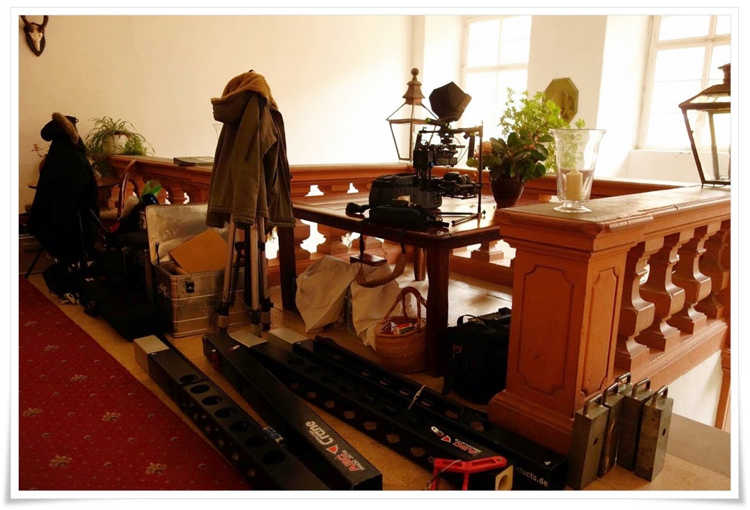 Ich merke gerade, dass ich den Bericht über die Dreharbeiten vom Anfang Dezember ja noch "schuldig" bin, für welche (u.a.) ich die letzte Anglaise genäht hatte.Aufgenommen wurde in Zeilitzheim, einem ganz hübschen Barockschlösschen, welches jetzt einen Hotelbetrieb beherbergt und es handelte sich um Dreharbeiten vom SWR. Soweit ich weiß, werden die Sequenzen für eine einstündige Ausstrahlung anläßlich des Karlsruher Stadtjubiläums dieses Jahr im Frühsommer und für das SWR-Bildungsfernsehen (Planet Schule) verwendet werden.Dafür sind in den vergangenen Monaten bereits weitere Szenen gedreht worden, u.a. in Schwetzingen.Unser Thema war eine Feier eines Landadeligen; vormittags in einfacherer Tageskleidung eine Übungsstunde mit einem Tanzmeister, dann eine Buffetszene die dann bereits abends bei der eigentlichen Feier spielt und der vorher geübte Tanz.Regievorgaben gab es kaum - lediglich ein "macht einfach, was ihr sonst auch immer macht" und einige wenige Wiederholungen für Detailaufnahmen. Das war ungewöhnlich und angenehm zugleich.Entgegen der ursprünglichen Information gab es auch keine weiteren Aufnahmen von Alltagsszenen wie flanieren, lesen, schreiben etc pp. und so waren wir nachmittags gegen 15 Uhr bereits mit allem fertig und konnten über den Rest des Tages wie auch schon des Vorabends frei verfügen.Das Bild oben ist nach Drehschluß entstanden (für die 2014er Weihnachtskarten).Alle folgenden Bilder sind von M. Paulick; herzlichen Dank dafür!die Ruhe vor dem Sturm; das Kamera-Equipment vor dem Dreh im Flur Warten auf die erste Szene Musik; natürlich nicht vom Band kurze Regieanweisung; der Herr in Blau ist der Drehleiter, rechts im Bild sieht man den Kameraarm
