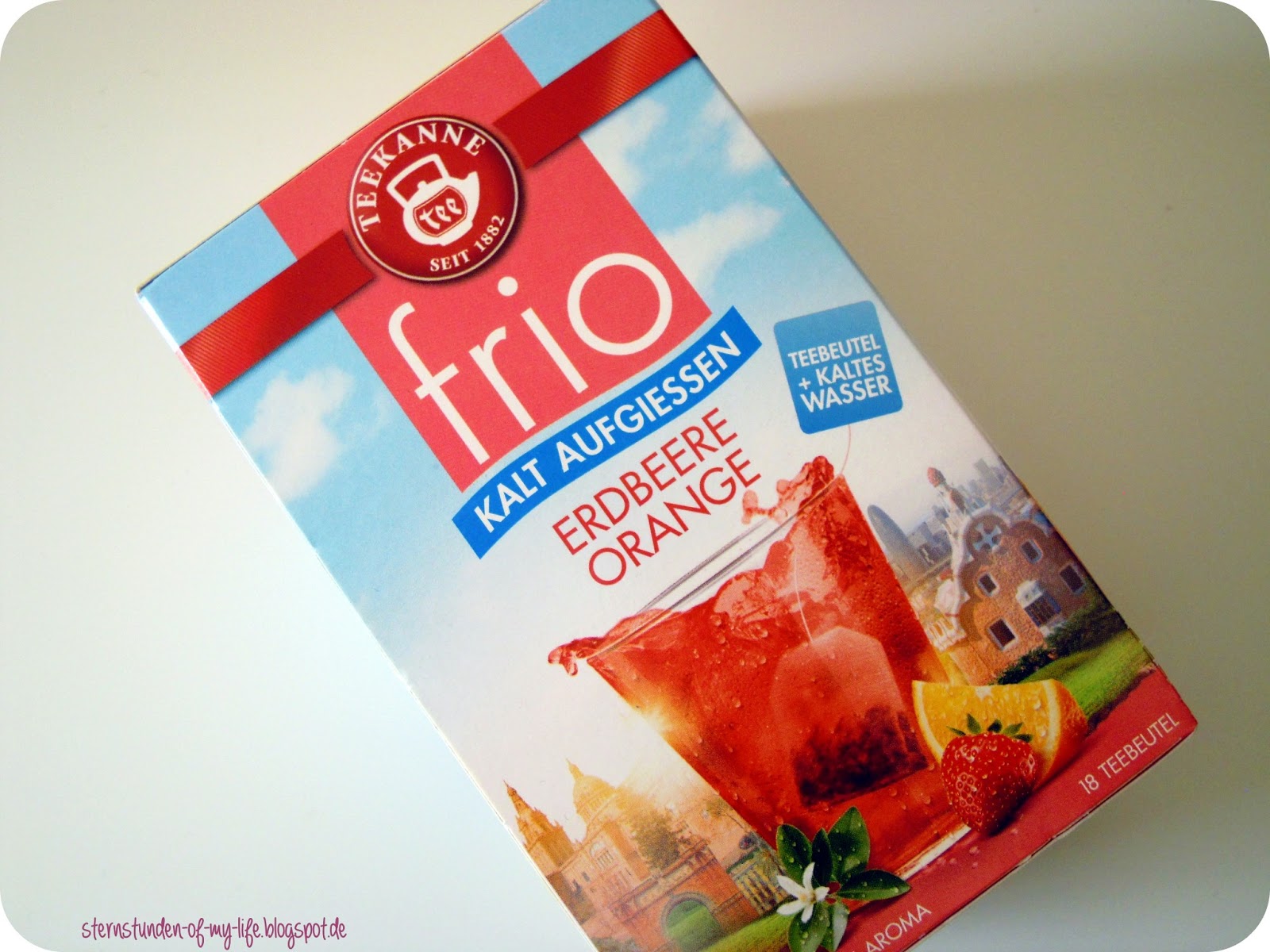 Teekanne frio ist ein kühler Früchtetee, der ganz einfach mit kaltem Leitungswasser zubereitet wird. Ich habe die Variante Erdbeer-Orange mitgenommen. Es gibt noch Limette-Minze und Apfel-Hollunder, die ich sicher auch noch austesten werde!