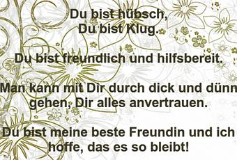 Auf Facebook teilen Vorige Folgende Du bist hübsch, Du bist Klug. Du bist... Autor des Artikels : istdaslustig Zum Original-Artikel Du bist hübsch, Du bist Klug. Du bist freundlich und hilfsbereit. Man kann mit Dir durch dick und dünn gehen, Dir alles anvertrauen. Du bist meine beste Freundin und ich hoffe, das es so bleibt! Hier geht es zum Artikel Mehr Lustiges auf www.istdaslustig.de Auf Facebook teilen Vorige Folgende Das könnte Ihnen gefallen Mehr