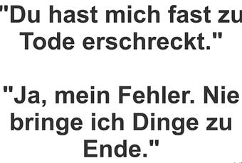 Auf Facebook teilen Vorige Folgende "Du hast mich fast zu Tode erschreckt." "Ja,... Autor des Artikels : istdaslustig Zum Original-Artikel "Du hast mich fast zu Tode erschreckt." "Ja, mein Fehler. Nie bringe ich Dinge zu Ende." Hier geht es zum Artikel Mehr Lustiges auf www.istdaslustig.de Auf Facebook teilen Vorige Folgende Das könnte Ihnen gefallen Mehr