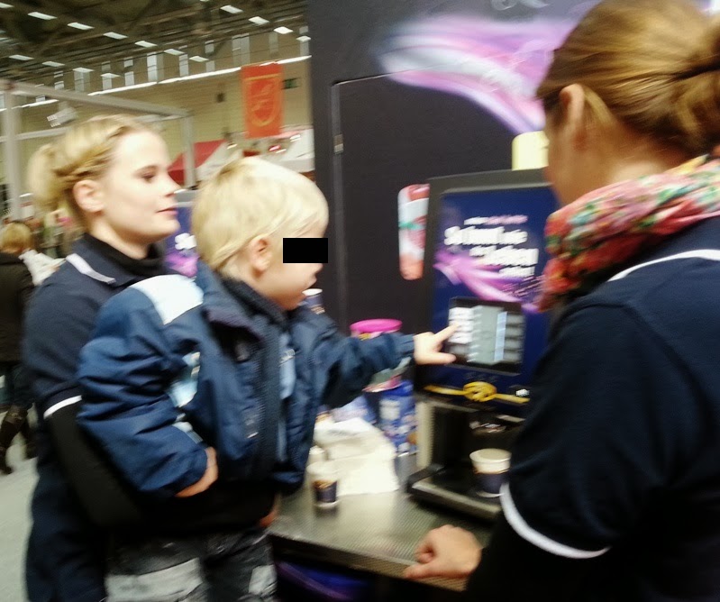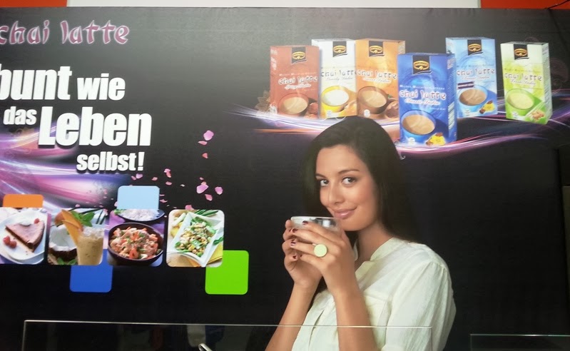 Ich persönlich fand ja eher die allgemeinen Neuheiten wie Küchengeräte & Lebensmittel viel interessanter :-)Nun gut, Thermomix und Tefal (Actifry) waren nun nicht neu, aber es ist natürlich immer wieder sehr interessant mitzuerleben, wie diese Geräte arbeiten und was sie alles leisten können.Da es sehr voll war, war es auch schwierig, neben dem Kinderhüten, vernünftige Fotos zu machen, denn unsere Minis wollten natürlich immer mit auf den Bildern erscheinen :-) Und ihr wisst ja, was ich von Kinderfotos im Netz halte...Nun ja, ein Stand hat uns definitiv sehr beeindruckt (besonders mich), denn seit der ANUGA bin ich ja bekennender Chai Fan und ich ich konnte mir nicht vorstellen, das mir der Chai von Krüger wirklich überzeugen könnte.Doch ich wurde eines besseren belehrt :-) Die Damen an diesem Stand waren sehr freundlich und bezogen auch unsere Jungs mit ein und ließen sie auf die Knöpfe des vorhandenen Automaten drücken :-) Dadurch gab es für meine Freundin und mich eine Art kleine Pause, in der wir in Ruhe den Chai probieren konnten :-)
