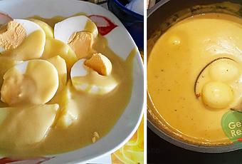 Jetzt noch mit Salz und Pfeffer etwas würzen und köcheln lassen.Die geschälten Eier gebe ich mit in die soße,so nehmen sie den Geschmack ein wenig an.