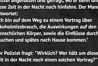 Der Polizist fragt: "Wirklich? Wer hält um diese Zeit in der Nacht noch einen solchen Vortrag?"