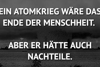 Auf Facebook teilen Vorige Folgende EIN ATOMKRIEG WÄRE DAS ENDE DER MENSCHHEIT.... Autor des Artikels : istdaslustig Zum Original-Artikel EIN ATOMKRIEG WÄRE DAS ENDE DER MENSCHHEIT. ABER ER HÄTTE AUCH NACHTEILE. Hier geht es zum Artikel Mehr Lustiges auf www.istdaslustig.de Auf Facebook teilen Vorige Folgende Das könnte Ihnen gefallen Mehr